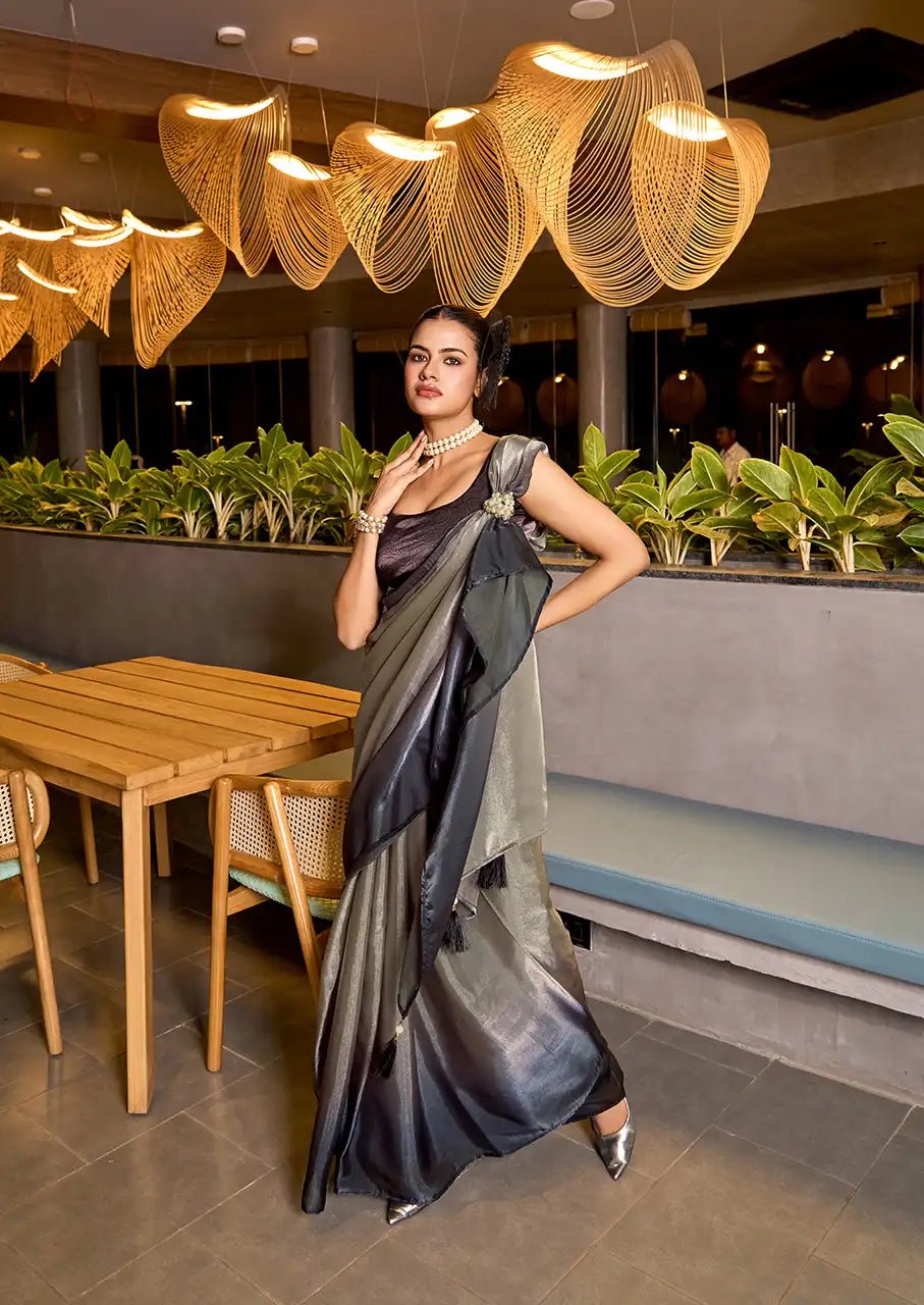 charcoal grey saree, black silk saree, Indo silk saree, Fendy satin blend saree, satin silk saree, grey black saree, formal silk saree for women, party wear saree, festive wear silk saree, elegant saree design