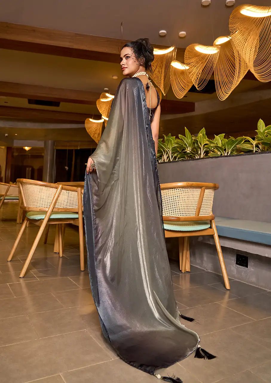 Charcoal Grey & Black Indo Silk Saree in Fendy Satin BlendCharcoal Grey & Black Indo Silk Saree in Fendy Satin Blend