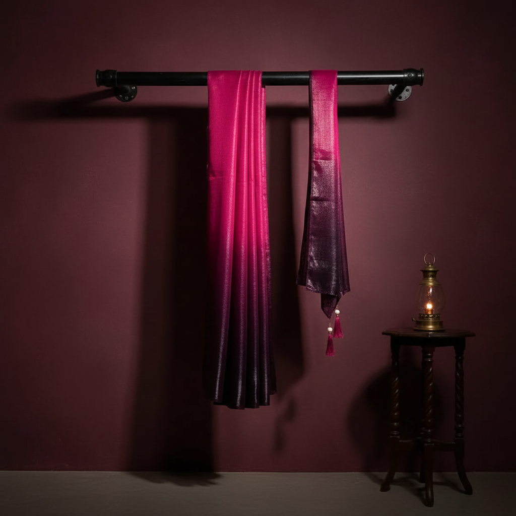 A rich wine and plum saree with a smooth satin finish and classic Indo silk feel